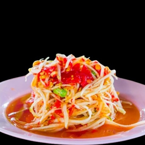 pikanter Salat von grüner Papaya mit Erdnüssen, Cherrytomaten grünen Schlangenbohnen, gewürzt mit Haussauce, Chili und Koriander